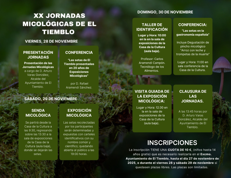19:15 Conferencia "Las detas de El Tiemblo presentadas en 20 años de exposiciones Micoclógicas", por D. Rafael Aramendi Sánchez.